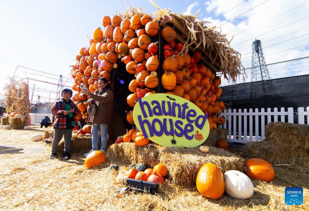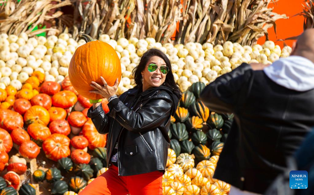A visitor poses for photos with a pumpkin at the Pumpkinville in Toronto, Canada, Oct. 15, 2022. The 2022 edition of Pumpkinville takes place in Toronto from Sept. 30 to Oct. 31. The pop-up show features various pumpkin sculptures and houses made with over 30,000 real pumpkins. (Photo by Zou Zheng/Xinhua)