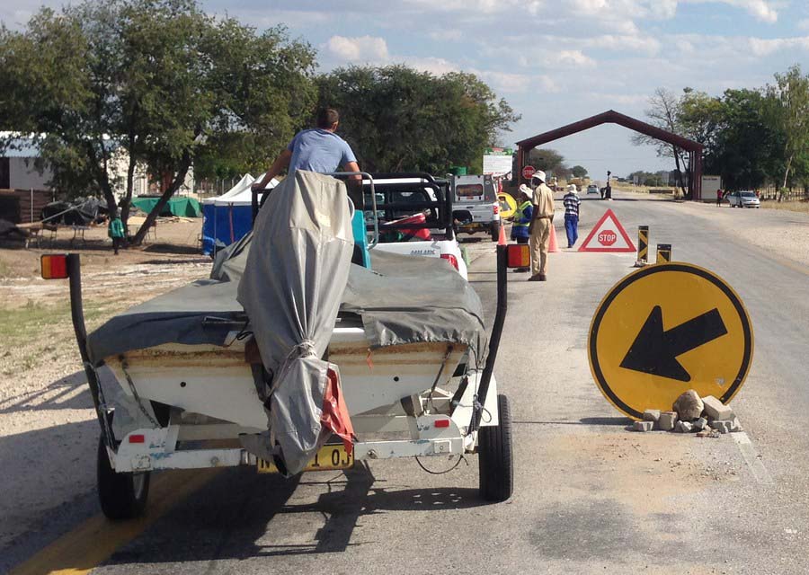 Vehicles wait to be checked to prevent the spread of foot-and-mouth disease at a checkpoint north of Grootfontein in the northern part of Namibia on May 6, 2016. (Xinhua/Wu Changwei)
