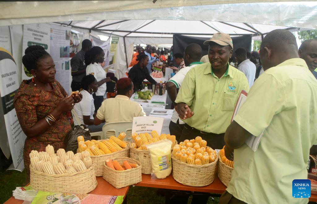 Visitors tour a maize stall during an agricultural products exhibition to mark the World Food Day at National Crops Resources Research Institute, Wakiso district, Uganda, Oct. 16, 2022. (Photo by Nicholas Kajoba/Xinhua)