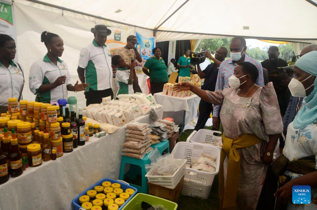 Photo taken on Oct. 16, 2022 shows Ugandan Prime Minister Robinah Nabbanja (2nd R, front) visiting a stall during an agricultural products exhibition to mark the World Food Day at National Crops Resources Research Institute, Wakiso district, Uganda. (Photo by Nicholas Kajoba/Xinhua)