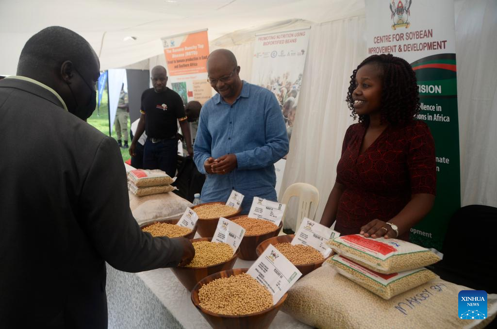 A visitor talks to an exhibitor of soybeans during an agricultural products exhibition to mark the World Food Day at National Crops Resources Research Institute, Wakiso district, Uganda, Oct. 16, 2022. (Photo by Nicholas Kajoba/Xinhua)