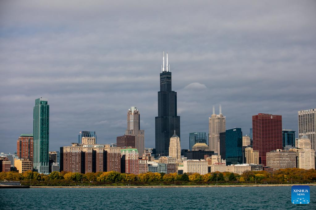 Fall colors blanket the ground of the skyline of Chicago with Lake Michigan in the foreground in downtown Chicago, the United States, Oct. 16, 2022. (Photo by Vincent D. Johnson/Xinhua)