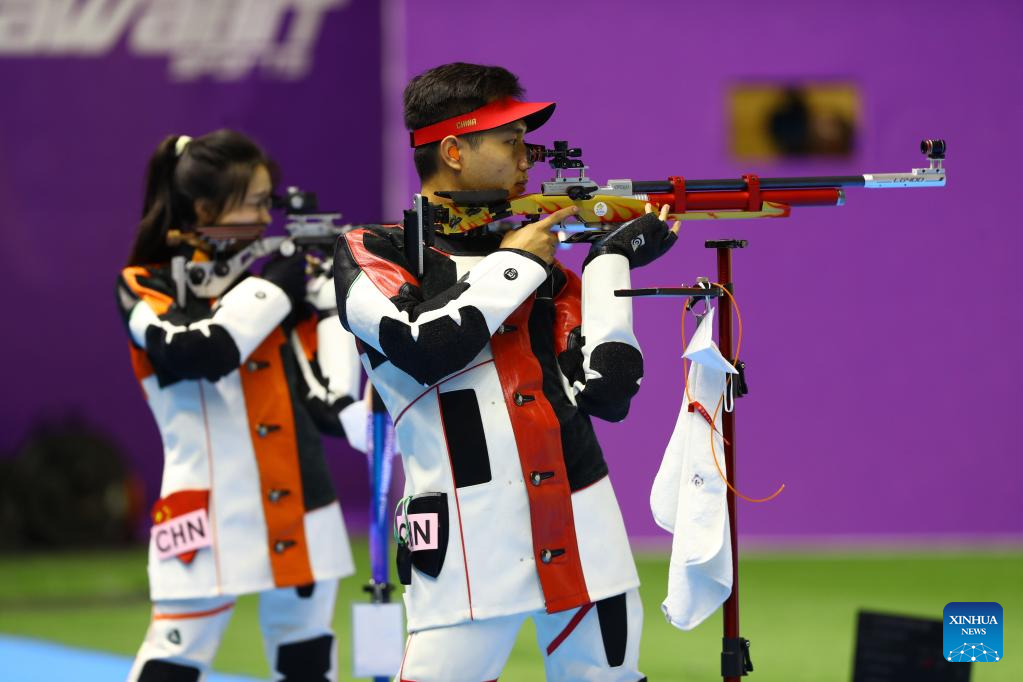 Huang Yuting/Yang Haoran (R) of China compete during the 10m air rifle mixed team gold medal match between China and South Korea at the ISSF World Championship Rifle/Pistol in Cairo, Egypt, Oct. 17, 2022. (Xinhua/Ahmed Gomaa)