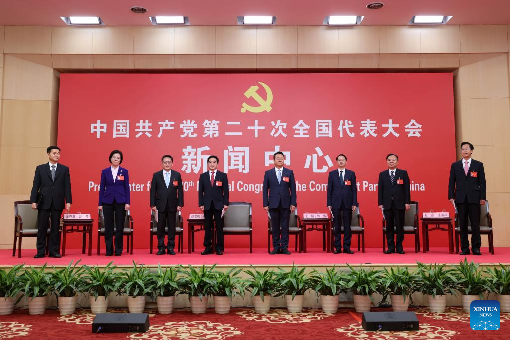 The spokespersons for delegations from Heilongjiang, Shanghai, Jiangsu, Zhejiang, Anhui, Fujian and Jiangxi to the 20th National Congress of the Communist Party of China (CPC) meet the press during a group interview in Beijing, Oct. 18, 2022. The press center for the 20th CPC National Congress hosted its second group interview on Tuesday. During the interview, the spokespersons introduced the delegations' study and discussion on the report to the 20th CPC National Congress, and answered questions from journalists. (Xinhua/Chen Jianli)