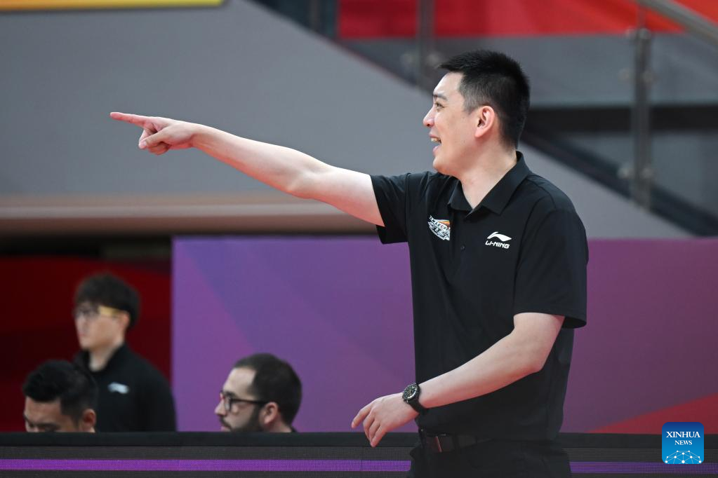 Coach of Liaoning Flying Leopards Yang Ming gestures during the 4th round match against Guangzhou Loong Lions at the 2022-2023 season of the Chinese Basketball Association (CBA) league in Hangzhou, east China's Zhejiang Province, Oct. 18, 2022. (Xinhua/Chen Zhenhai)