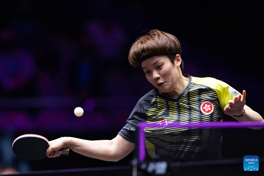 Doo Hoi Kem of China's Hong Kong hits a return during the women's singles round of 32 match against Cheng I-Ching of Chinese Taipei at the WTT Champions Macao 2022 in Macao, south China, Oct. 19, 2022. (Xinhua/Cheong Kam Ka)