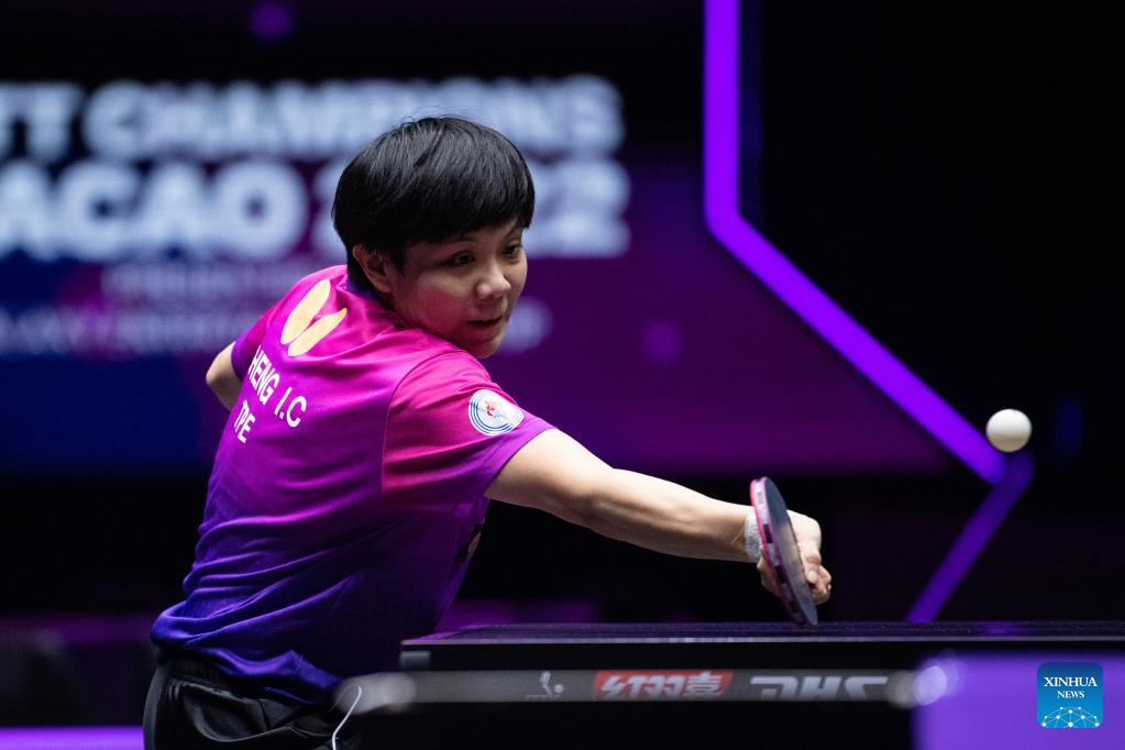 Cheng I-Ching of Chinese Taipei hits a return during the women's singles round of 32 match against Doo Hoi Kem of China's Hong Kong at the WTT Champions Macao 2022 in Macao, south China, Oct. 19, 2022. (Xinhua/Cheong Kam Ka)
