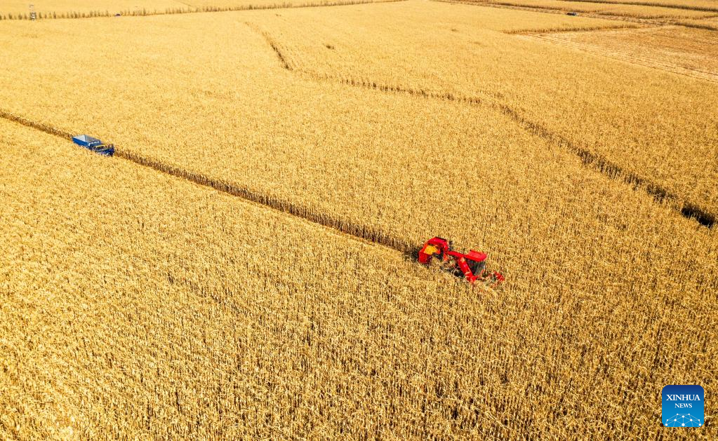 This aerial photo shows farmers harvesting corn in Naiman Banner of Tongliao City, north China's Inner Mongolia Autonomous Region, Oct. 13, 2022. (Xinhua/Lian Zhen)