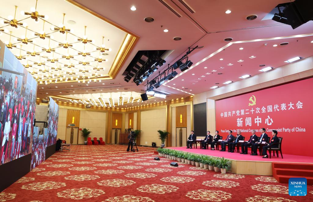 The spokespersons for delegations from Chongqing, Sichuan, Guizhou, Yunnan, Tibet, Shaanxi and Gansu to the 20th National Congress of the Communist Party of China (CPC) meet the press via video link during a group interview in Beijing, capital of China, Oct. 19, 2022. The press center for the 20th CPC National Congress hosted its fourth group interview on Wednesday. During the interview, the spokespersons introduced the delegations' study and discussion on the report to the 20th CPC National Congress, and answered questions from journalists. (Xinhua/Chen Jianli)