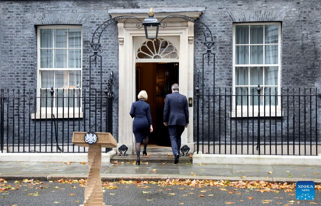 United Kingdom (UK) Prime Minister Liz Truss (L) leaves after making a statement outside 10 Downing Street in London, Britain, Oct. 20, 2022. (Xinhua/Li Ying)