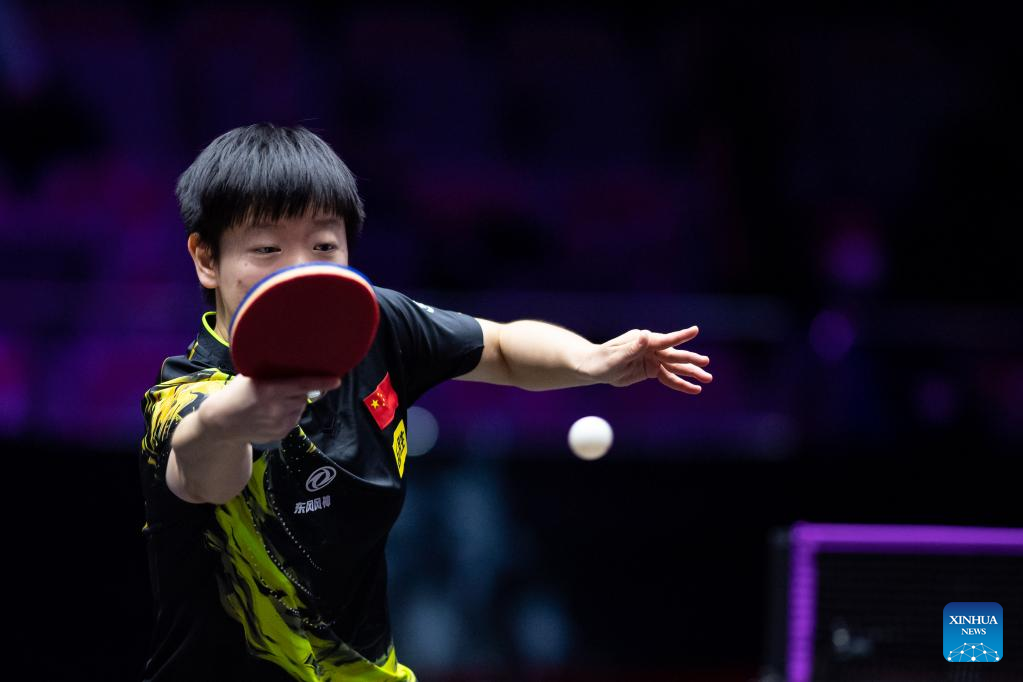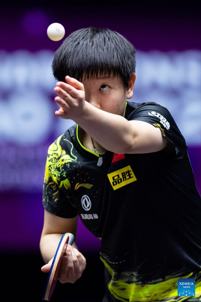 Sun Yingsha of China hits a return during the women's singles round of 32 match against Bruna Takahashi of Brazil at the WTT Champions Macao 2022 in Macao, south China, Oct. 20, 2022. (Xinhua/Cheong Kam Ka)