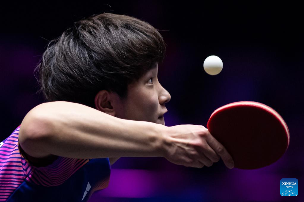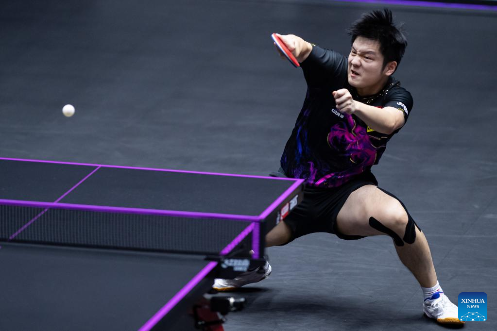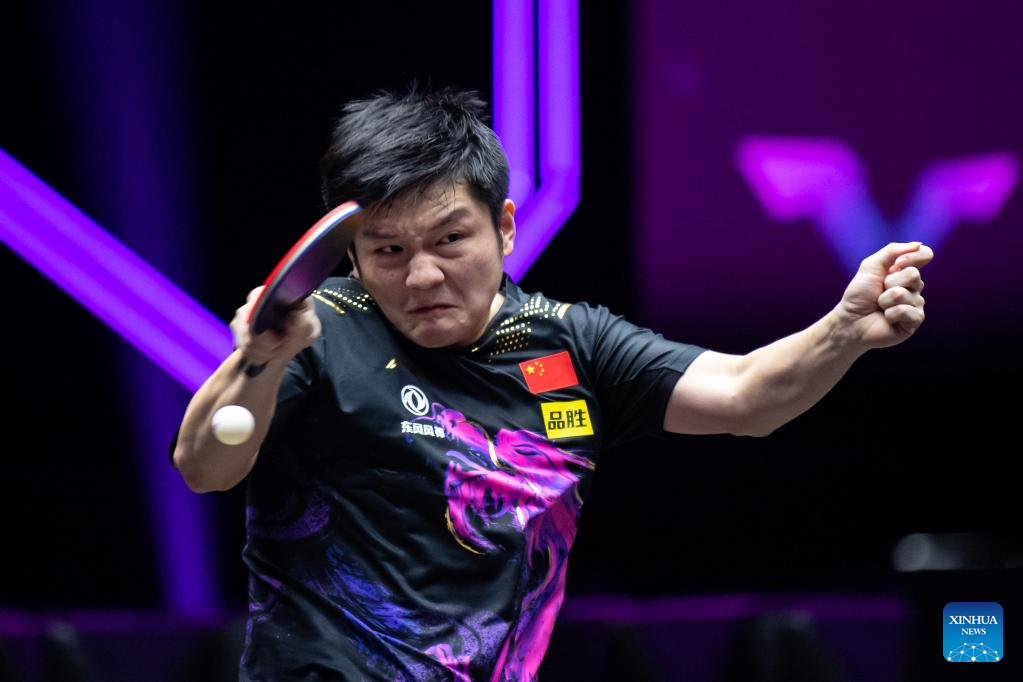 Fan Zhendong of China hits a return during the men's singles round of 32 match against Wong Chun Ting of China's Hong Kong at the WTT Champions Macao 2022 in Macao, south China, Oct. 20, 2022. (Xinhua/Cheong Kam Ka)