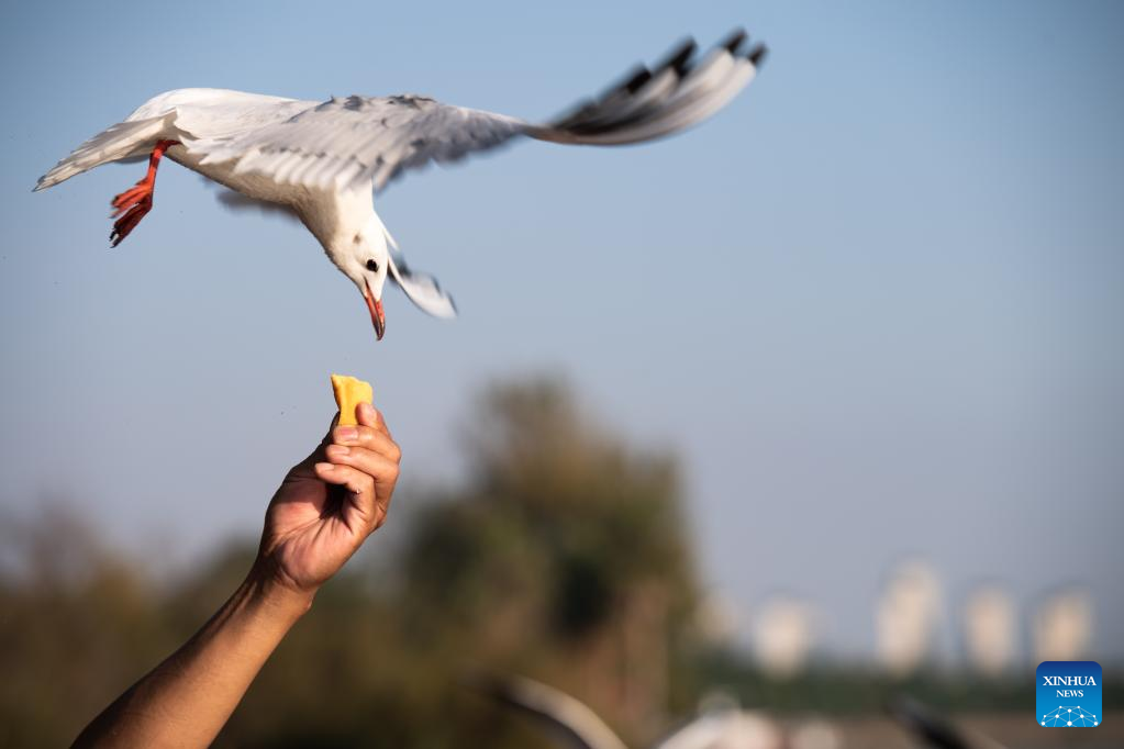 A citizen feeds a black-headed gull by the bank of Dianchi Lake in Kunming, southwest China's Yunnan Province, Oct. 20, 2022. Every year black-headed gulls fly to Kunming for warmer weather in winter. (Xinhua/Wang Guansen)