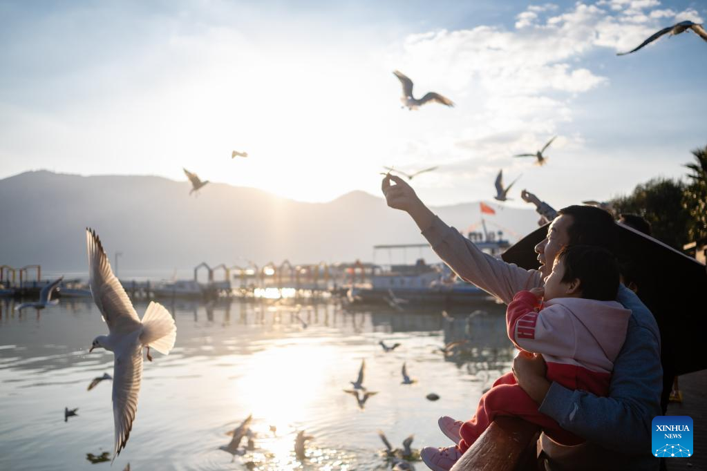A citizen feeds black-headed gulls by the bank of Dianchi Lake in Kunming, southwest China's Yunnan Province, Oct. 20, 2022. Every year black-headed gulls fly to Kunming for warmer weather in winter. (Xinhua/Wang Guansen)