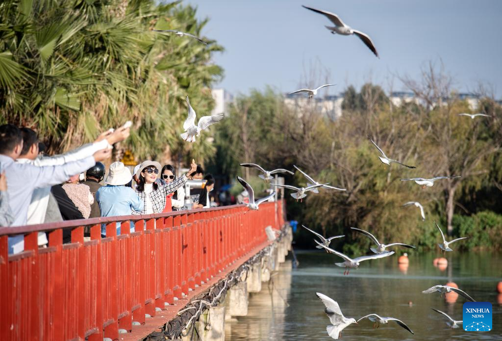 Citizens feed black-headed gulls by the bank of Dianchi Lake in Kunming, southwest China's Yunnan Province, Oct. 20, 2022. Every year black-headed gulls fly to Kunming for warmer weather in winter. (Xinhua/Wang Guansen)