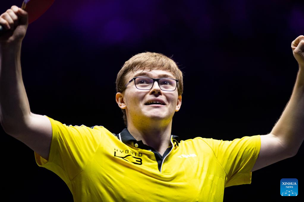 Alexis Lebrun of France celebrates after winning the men's singles round of 16 match against China's Liang Jingkun at the WTT Champions Macao 2022 in Macao, south China, Oct. 21, 2022. (Xinhua/Cheong Kam Ka)