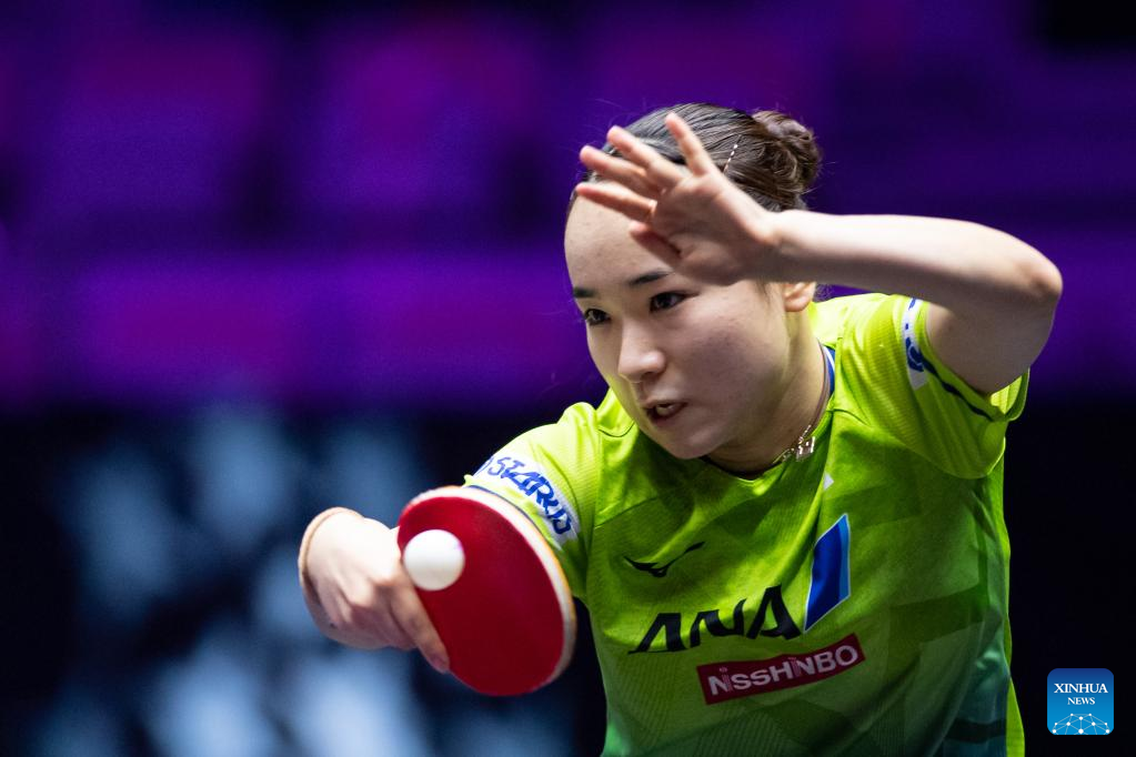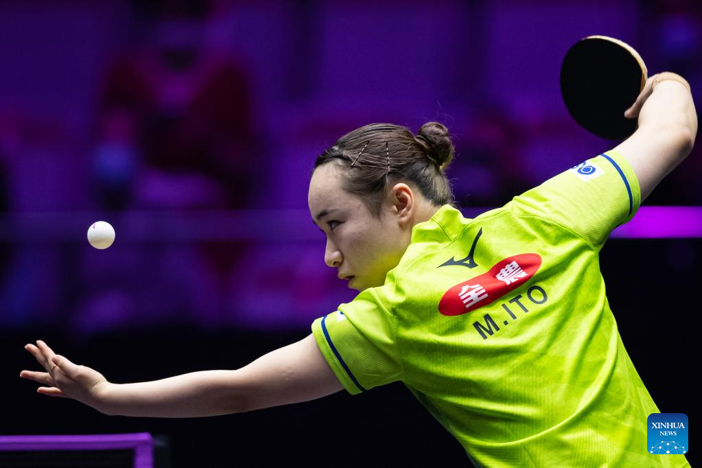 Ito Mima of Japan hits a return during the women's singles round of 16 match against her teammate Kihara Miyuu at the WTT Champions Macao 2022 in Macao, south China, Oct. 21, 2022. (Xinhua/Cheong Kam Ka)