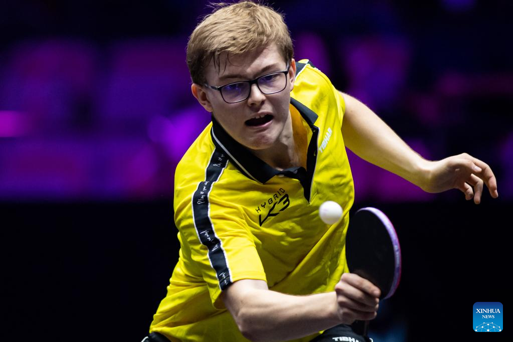 Alexis Lebrun of France hits a return during the men's singles round of 16 match against China's Liang Jingkun at the WTT Champions Macao 2022 in Macao, south China, Oct. 21, 2022. (Xinhua/Cheong Kam Ka)