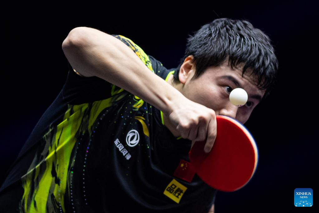 China's Liang Jingkun serves during the men's singles round of 16 match against Alexis Lebrun of France at the WTT Champions Macao 2022 in Macao, south China, Oct. 21, 2022. (Xinhua/Cheong Kam Ka)