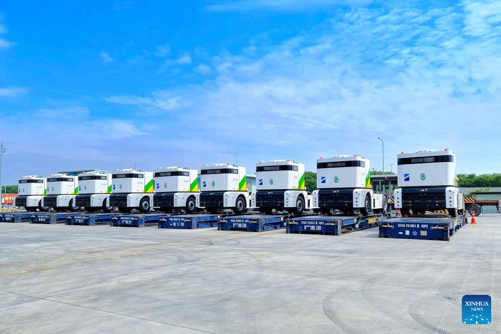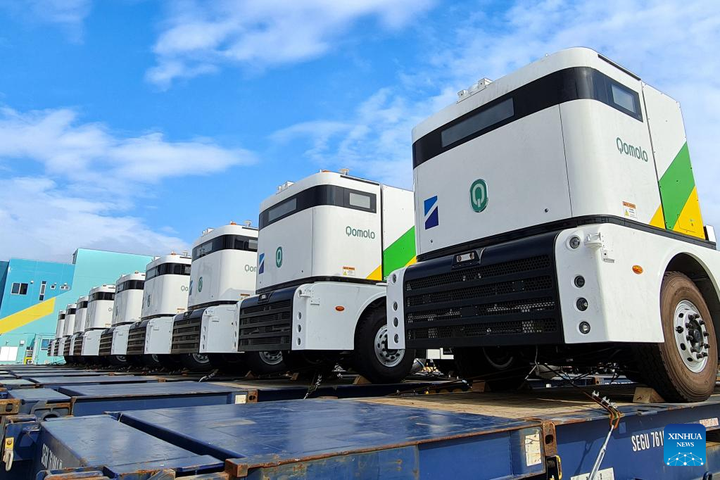 This photo taken on Oct. 19, 2022 shows the autonomous Q-Trucks at the Laem Chabang Port in Chonburi Province, Thailand. The Q-Trucks are built by Shanghai Westwell Information and Technology Company Ltd., a Chinese company specializing in AI development for commercial and industrial settings. Equipped with advanced AI machine-learning technology and a wireless charging system, the trucks are able to operate non-stop for more than 24 hours or can travel as far as 140 kilometers. (Xinhua)