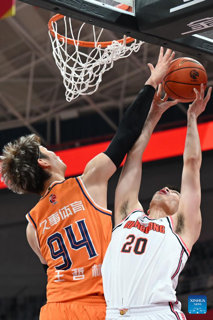 Ren Junfei (R) of Guangdong Southern Tigers vies with Wang Zhelin of Shanghai Sharks during the 4th round match at the 2022-2023 season of the Chinese Basketball Association (CBA) league in Hangzhou, east China's Zhejiang Province, Oct. 21, 2022. (Xinhua/Chen Zhenhai)
