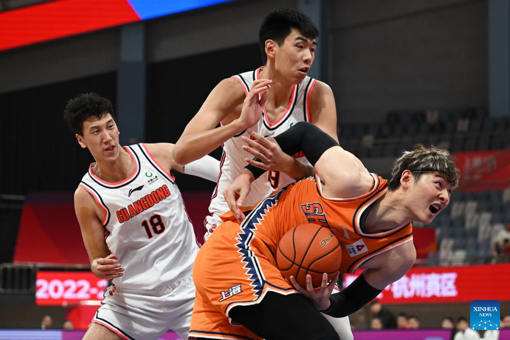 Xu Xin (C) of Guangdong Southern Tigers vies with Wang Zhelin (R) of Shanghai Sharks during the 4th round match at the 2022-2023 season of the Chinese Basketball Association (CBA) league in Hangzhou, east China's Zhejiang Province, Oct. 21, 2022. (Xinhua/Chen Zhenhai)