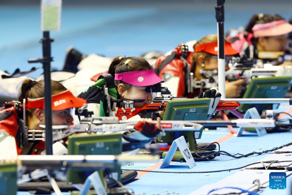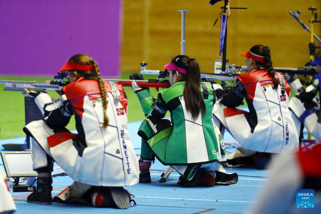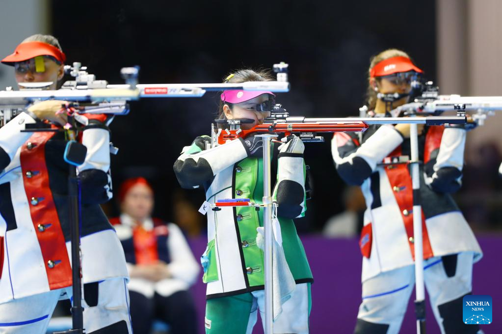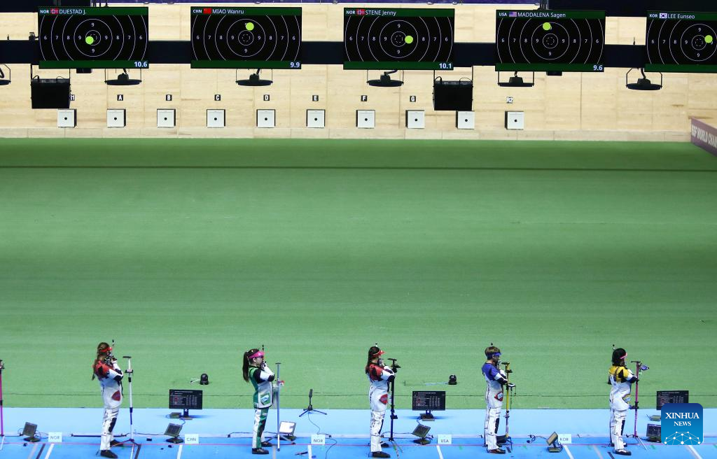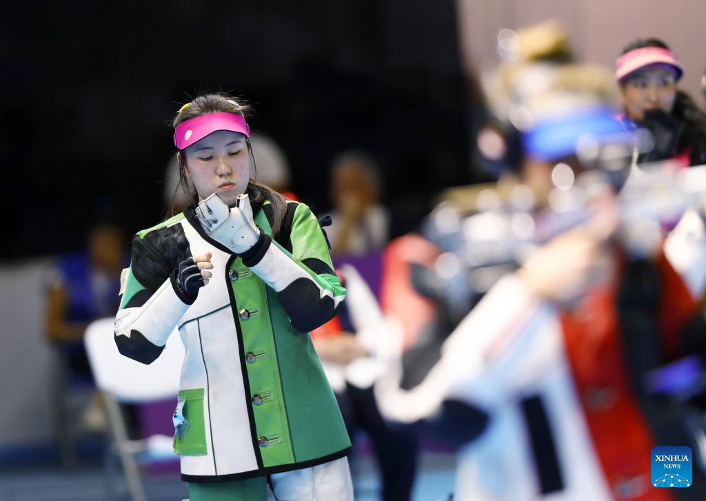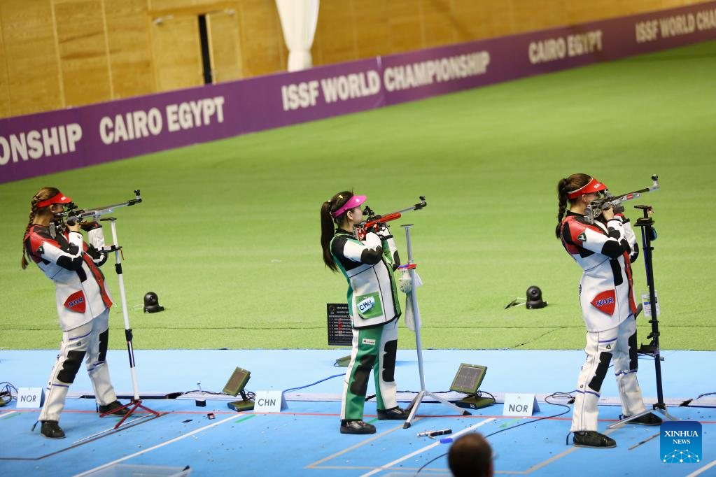 Miao Wanru (2nd L) of China competes during the women's 50m rifle 3 positions match at the ISSF World Championship Rifle/Pistol in Cairo, Egypt, Oct. 21, 2022. (Xinhua/Ahmed Gomaa)