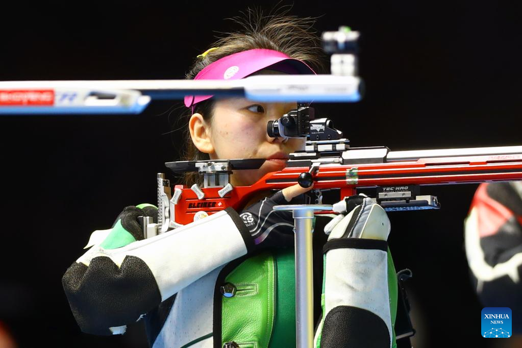 Miao Wanru (C) of China competes during the women's 50m rifle 3 positions match at the ISSF World Championship Rifle/Pistol in Cairo, Egypt, Oct. 21, 2022. (Xinhua/Ahmed Gomaa)