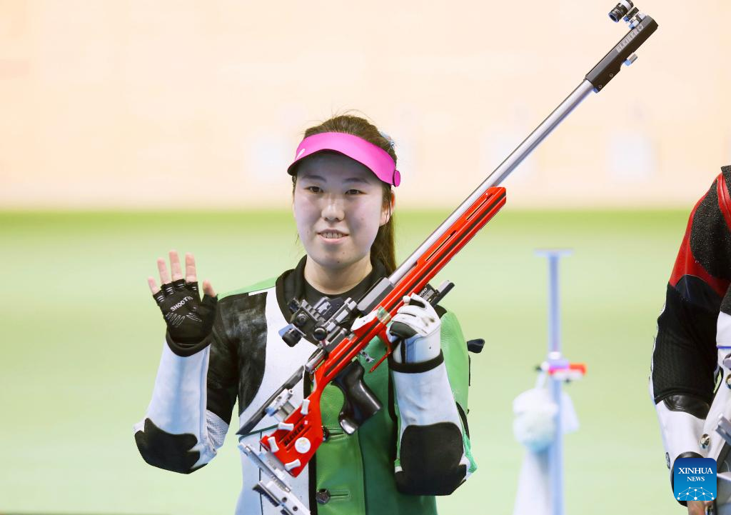 Miao Wanru of China gestures during the women's 50m rifle 3 positions match at the ISSF World Championship Rifle/Pistol in Cairo, Egypt, Oct. 21, 2022. (Xinhua/Ahmed Gomaa)