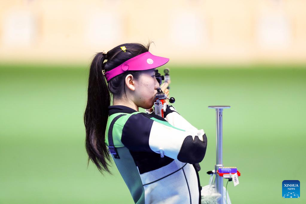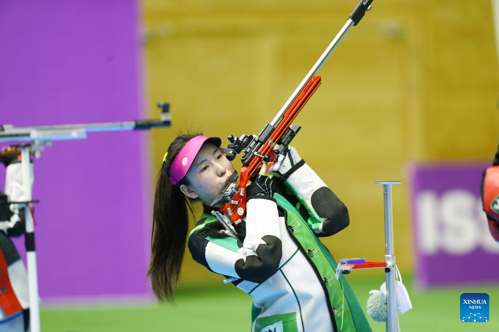 Miao Wanru of China competes during the women's 50m rifle 3 positions match at the ISSF World Championship Rifle/Pistol in Cairo, Egypt, Oct. 21, 2022. (Xinhua/Ahmed Gomaa)