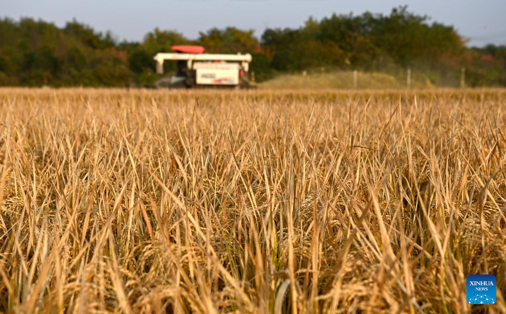 This photo taken on Oct. 21, 2022 shows a reaper harvesting paddy rice in Huangfu Village, Chang'an District of Xi'an City, northwest China's Shaanxi Province. In recent years, Chang'an District develops ecological paddy fields and combines paddy rice industry with tourism, which improves the quality of local paddy rice and local economy. (Xinhua/Liu Xiao)