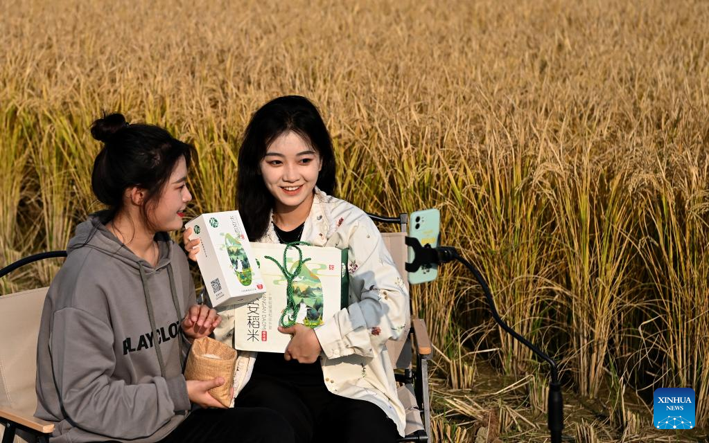 Livestreamers sell local rice through live-streaming platform in Huangfu Village, Chang'an District of Xi'an City, northwest China's Shaanxi Province, Oct. 21, 2022. In recent years, Chang'an District develops ecological paddy fields and combines paddy rice industry with tourism, which improves the quality of local paddy rice and local economy. (Xinhua/Liu Xiao)