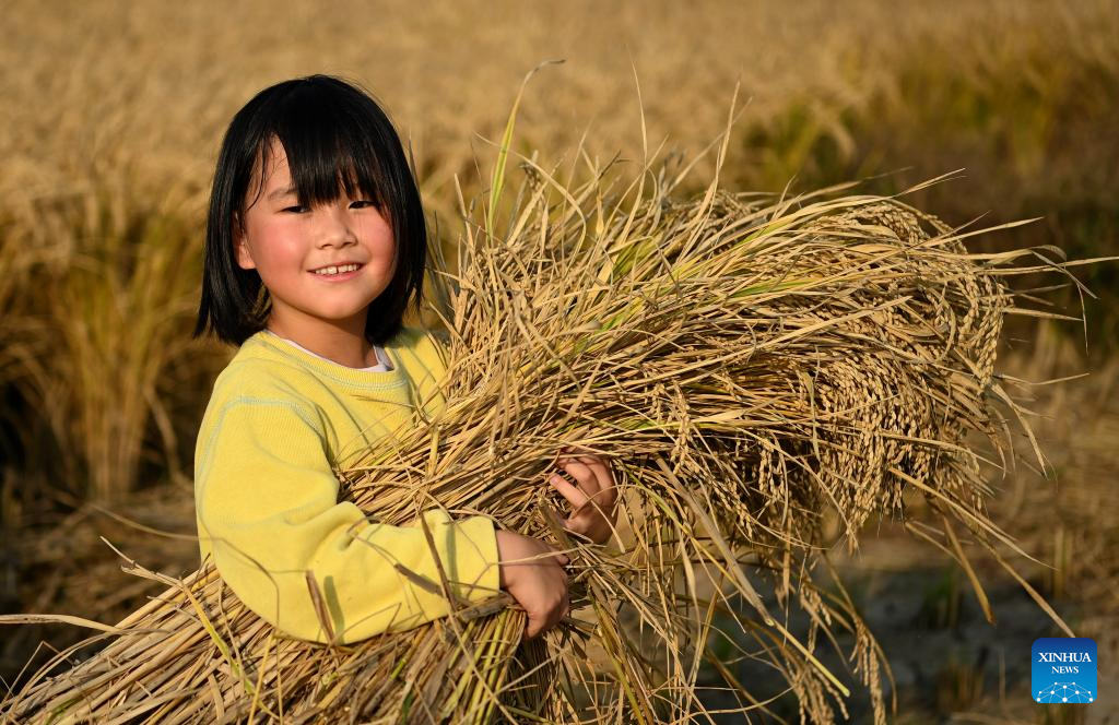A girl carries a bunch of paddy rice in Huangfu Village, Chang'an District of Xi'an City, northwest China's Shaanxi Province, Oct. 21, 2022. In recent years, Chang'an District develops ecological paddy fields and combines paddy rice industry with tourism, which improves the quality of local paddy rice and local economy. (Xinhua/Liu Xiao)