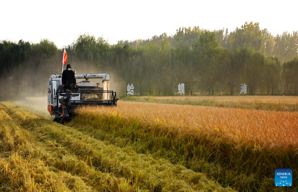 A villager riding a reaper harvests paddy rice in Huangfu Village, Chang'an District of Xi'an City, northwest China's Shaanxi Province, Oct. 21, 2022. In recent years, Chang'an District develops ecological paddy fields and combines paddy rice industry with tourism, which improves the quality of local paddy rice and local economy. (Xinhua/Liu Xiao)