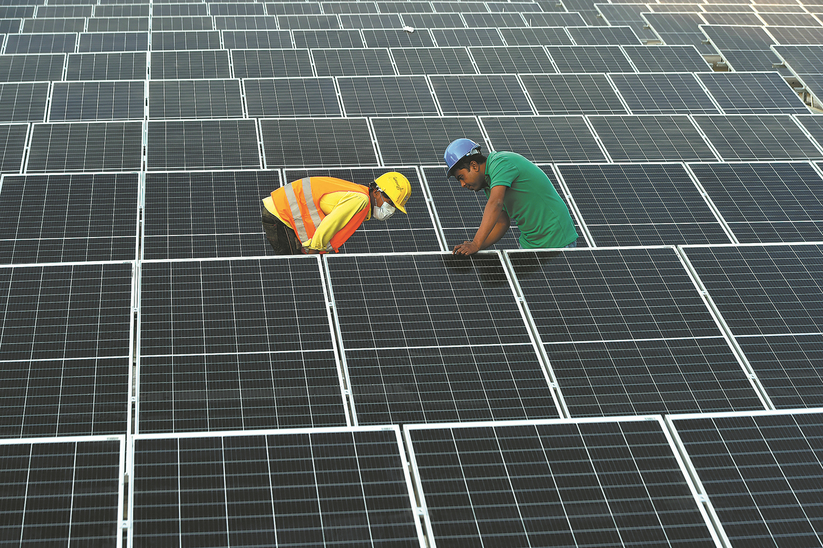 Workers assemble photovoltaic modules on the roof of a Chinese factory in Dhaka, Bangladesh, in January last year. [Photo/Xinhua]