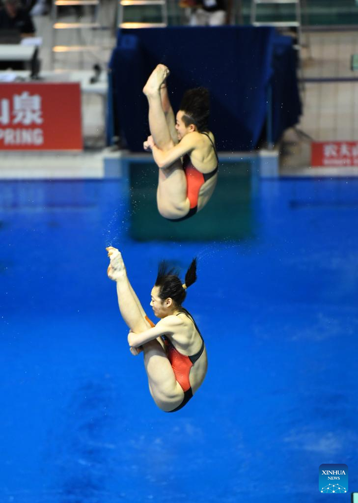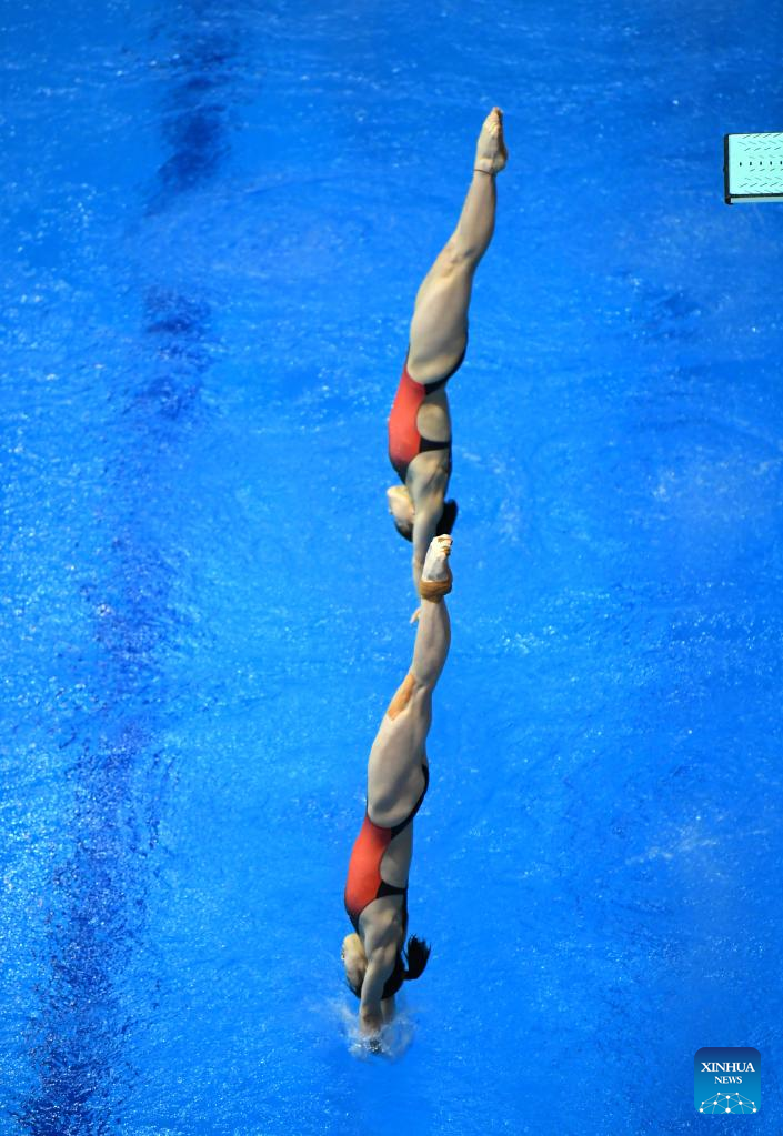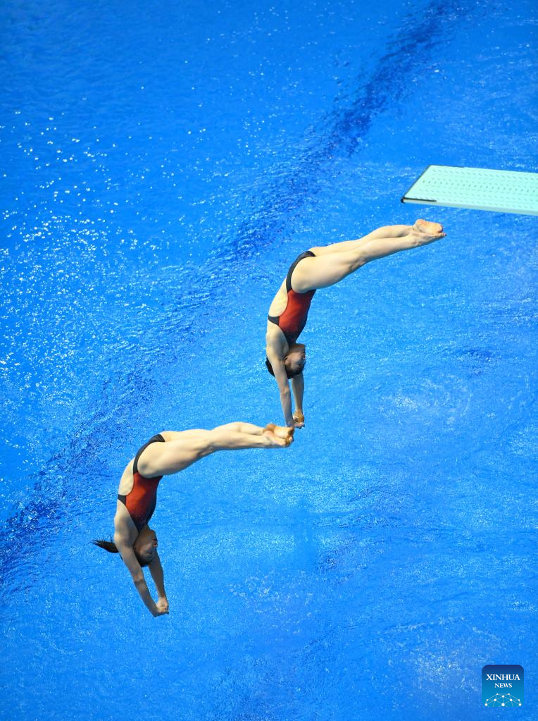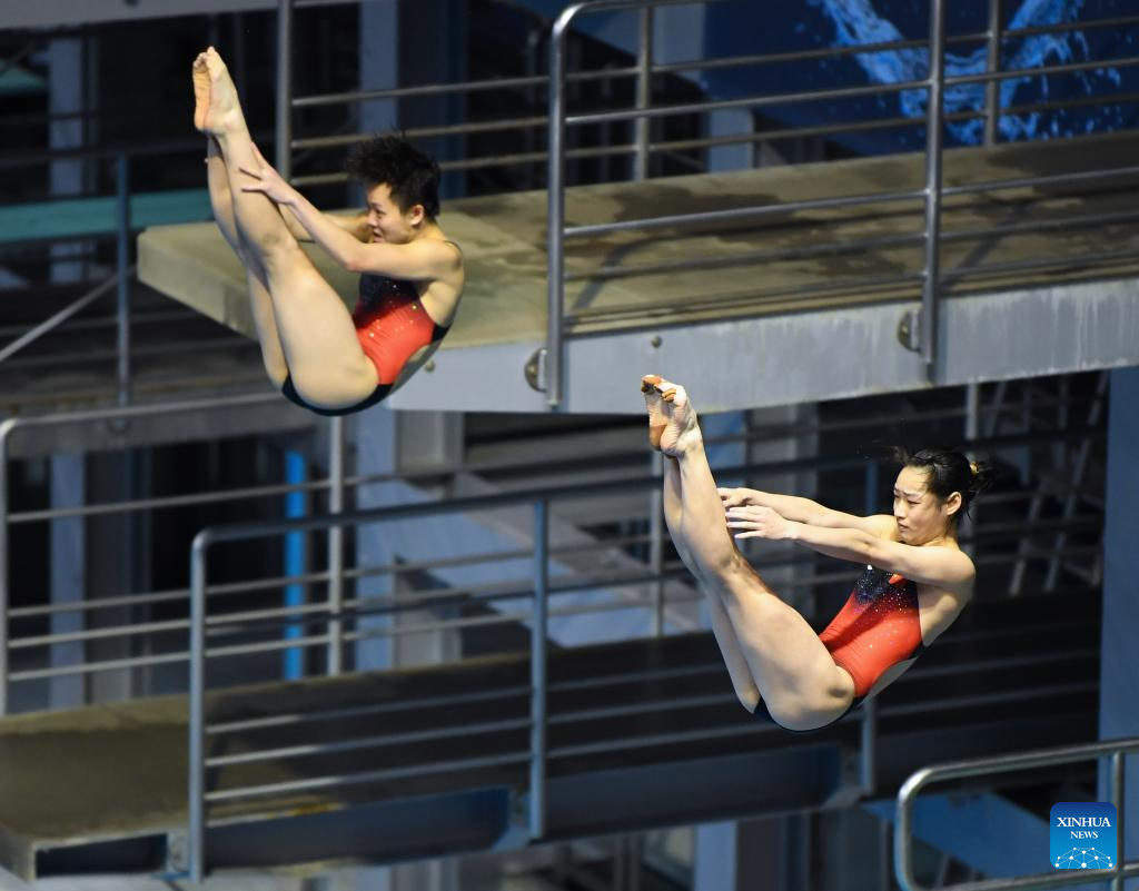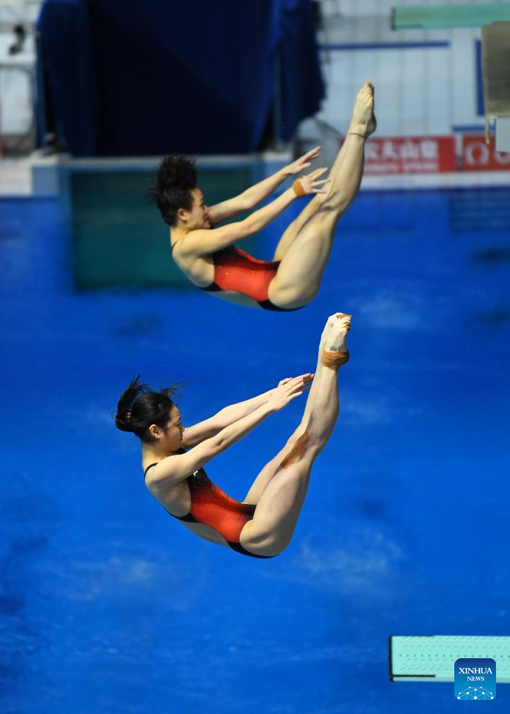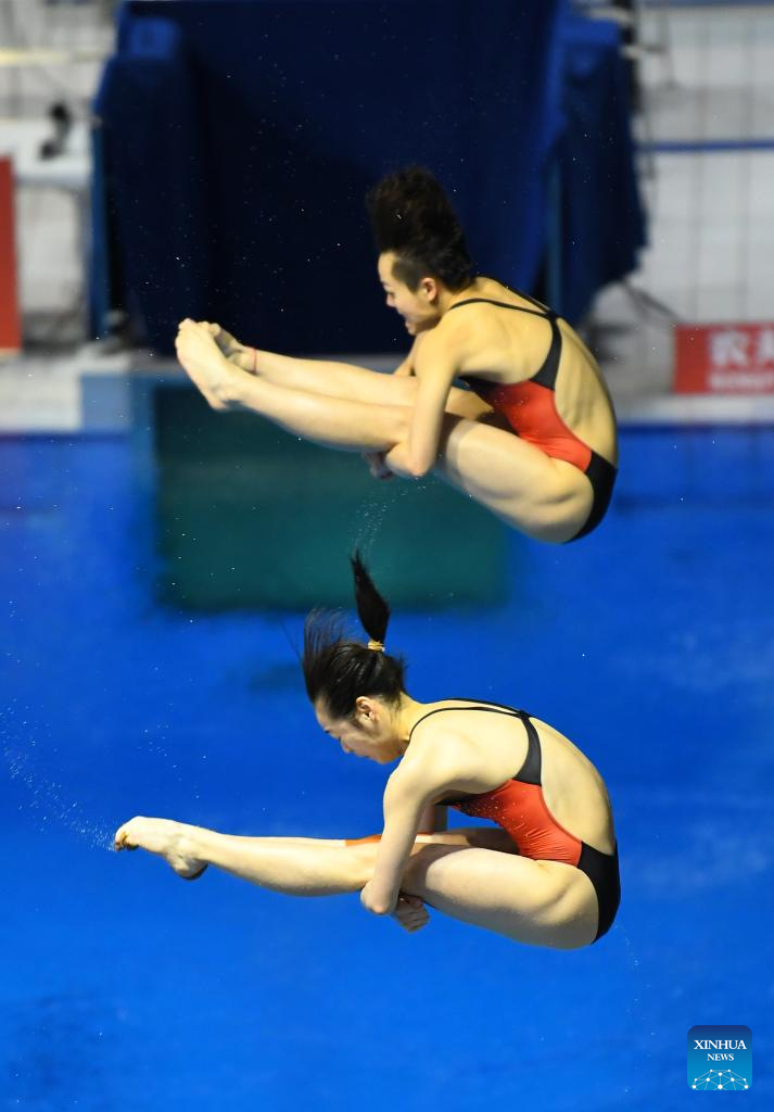 Chen Yiwen/Chang Yani (bottom) of China compete during the women's synchronized 3m springboard final at the FINA Diving World Cup in Berlin, Germany, Oct. 22, 2022. (Xinhua/Ren Pengfei)