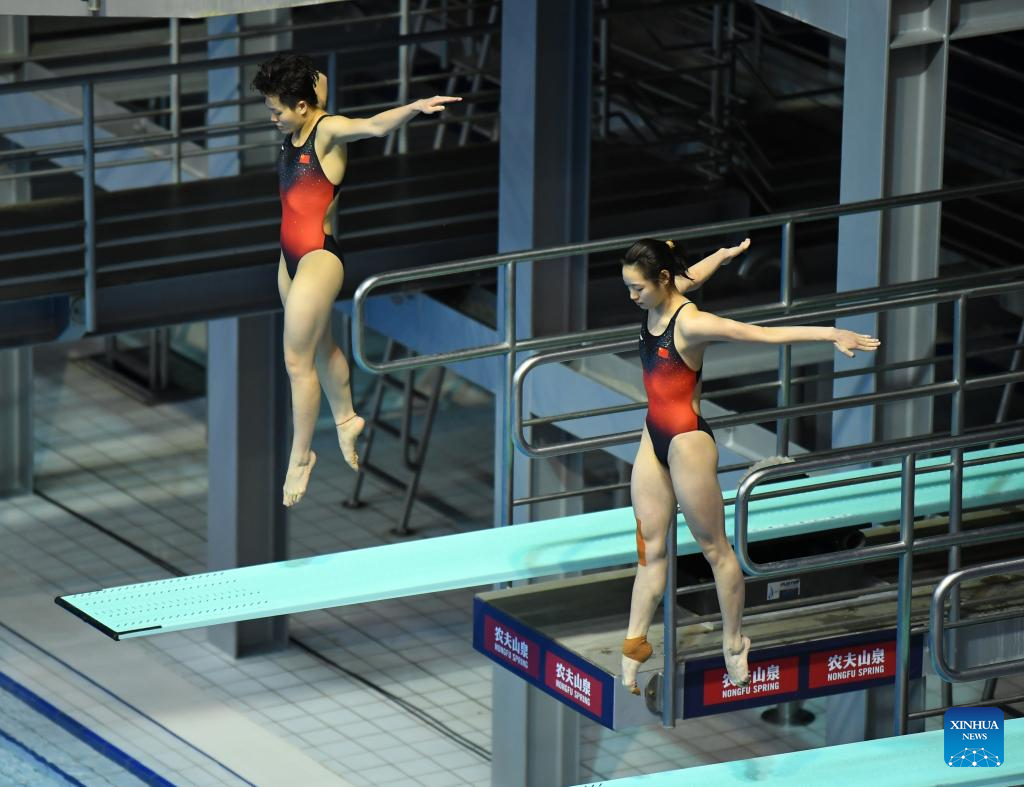 Chen Yiwen/Chang Yani (R) of China compete during the women's synchronized 3m springboard final at the FINA Diving World Cup in Berlin, Germany, Oct. 22, 2022. (Xinhua/Ren Pengfei)