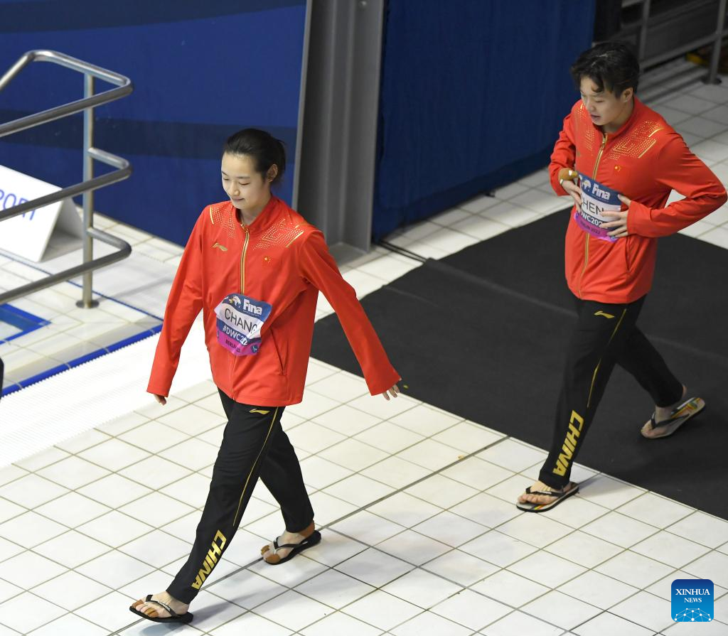Chen Yiwen/Chang Yani (L) of China react before the women's synchronized 3m springboard final at the FINA Diving World Cup in Berlin, Germany, Oct. 22, 2022. (Xinhua/Ren Pengfei)