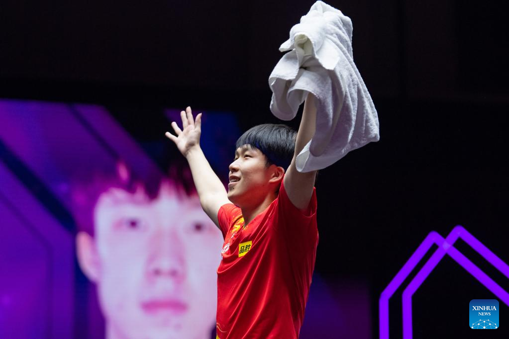 Wang Chuqin of China celebrates winning the men's singles final match against Fan Zhendong of China at the WTT Champions Macao 2022 in Macao, south China, Oct. 23, 2022. (Xinhua/Cheong Kam Ka)