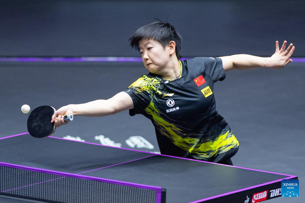 Sun Yingsha of China hits a return during the women's singles final match against Chen Xingtong of China at the WTT Champions Macao 2022 in Macao, south China, Oct. 23, 2022. (Xinhua/Cheong Kam Ka)