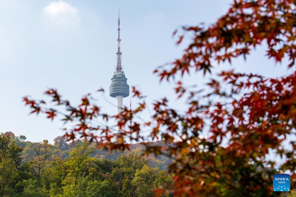 This photo taken on Oct. 23, 2022 shows the Namsan Seoul Tower amid autumn trees at Namsan Park in Seoul, South Korea. (Xinhua/Wang Yiliang)