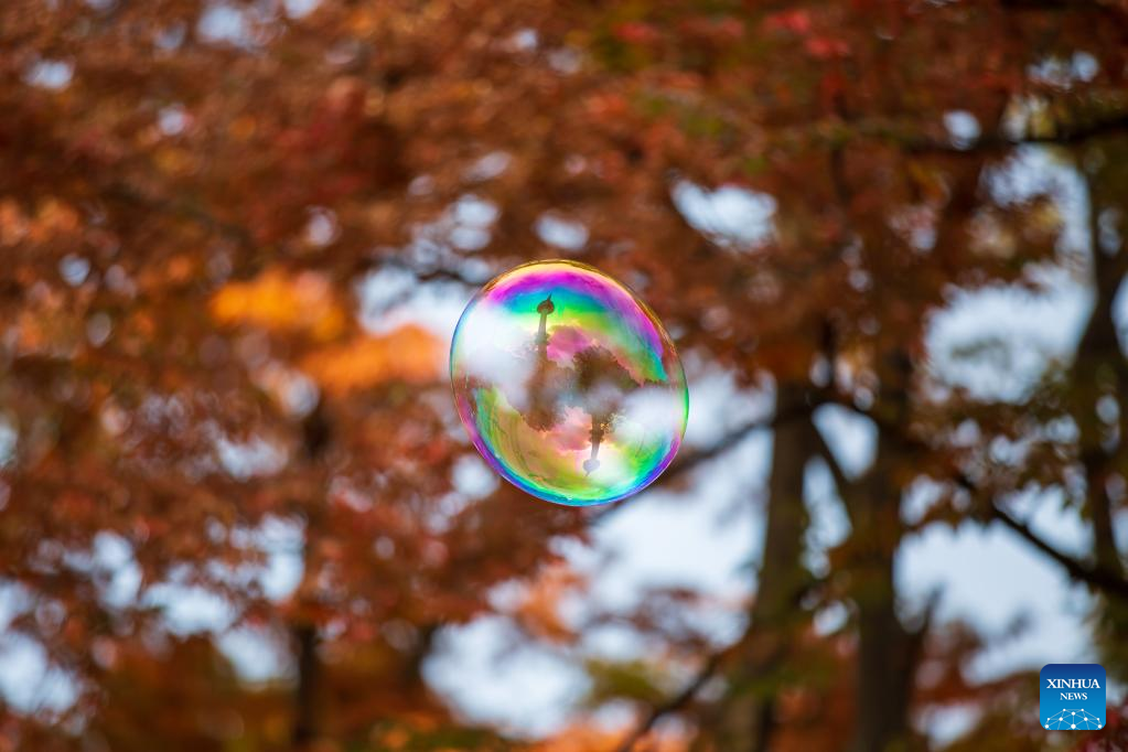 Children play with soap bubbles at Namsan Park in Seoul, South Korea, Oct. 23, 2022. (Xinhua/Wang Yiliang)