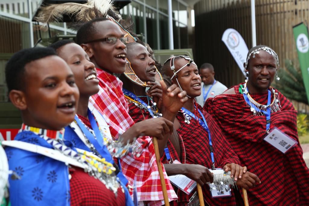 Maasai people sing a song during the opening ceremony of the 6th edition of the Swahili International Tourism Expo in Dar es Salaam, Tanzania, Oct. 22, 2022. (Photo by Herman Emmanuel/Xinhua)
