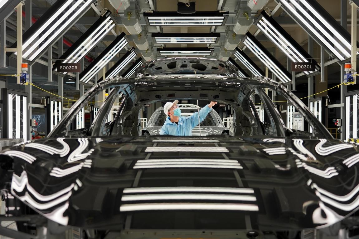 A worker checks the finish of a vehicle frame in a factory of Zeekr, an electric mobility technology and solutions brand under Chinese carmaker Geely in Ningbo, east China's Zhejiang province, Feb. 7, 2022. (People's Daily Online/Zhang Yongtao)