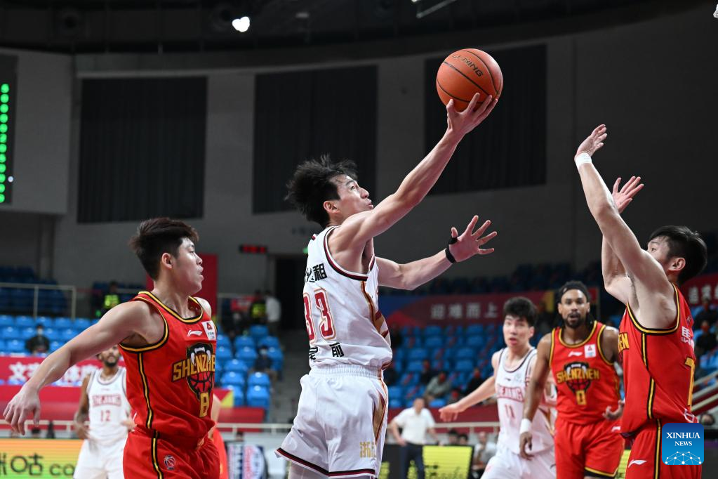 Wu Qian (C) of Zhejiang Golden Bulls shoots during the 7th round match between Zhejiang Golden Bulls and Shenzhen Leopards at the 2022-2023 season of the Chinese Basketball Association (CBA) league in Hangzhou, east China's Zhejiang Province, Oct. 24, 2022. (Xinhua/Chen Zhenhai)