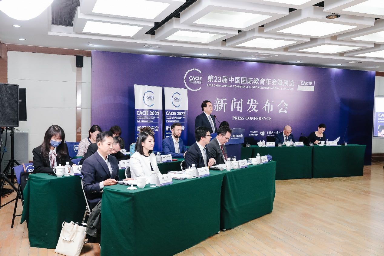 A press conference for the 2022 China Annual Conference and Expo for International Education (CACIE) was held in Beijing on Monday to outline the highlights of the event, with nearly 50 guests and media representatives attending.