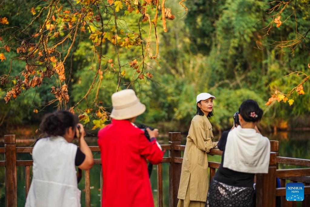 Tourists take photos in Huaxi national city wetland park in Guiyang, capital of southwest China's Guizhou Province, Oct. 25, 2022. (Xinhua/Tao Liang)