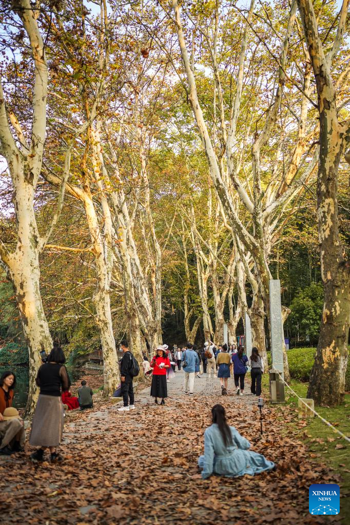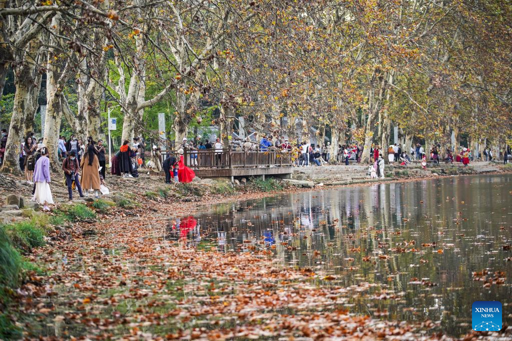 Tourists enjoy the autumn scenery of Huaxi national city wetland park in Guiyang, capital of southwest China's Guizhou Province, Oct. 25, 2022. (Xinhua/Tao Liang)