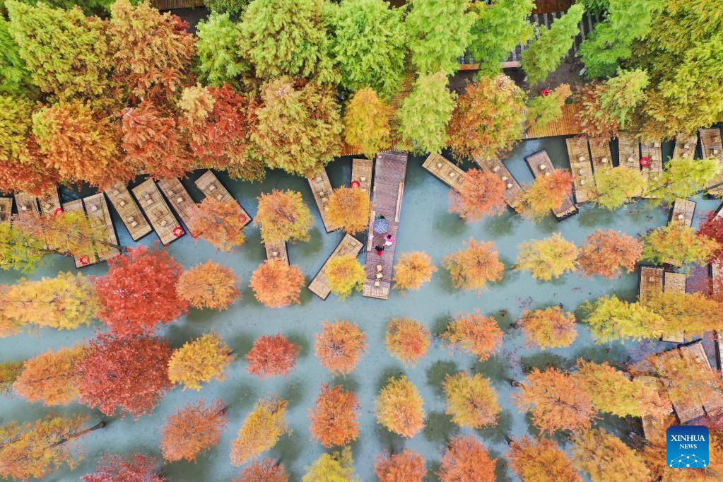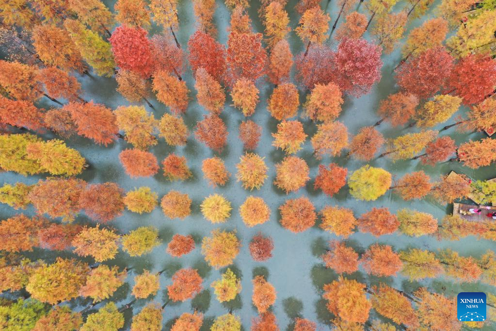 This aerial photo taken on Oct. 26, 2022 shows the autumn scenery of Hongze Lake Wetland Scenic Area in Sihong County, east China's Jiangsu Province. (Xinhua/Ji Chunpeng)