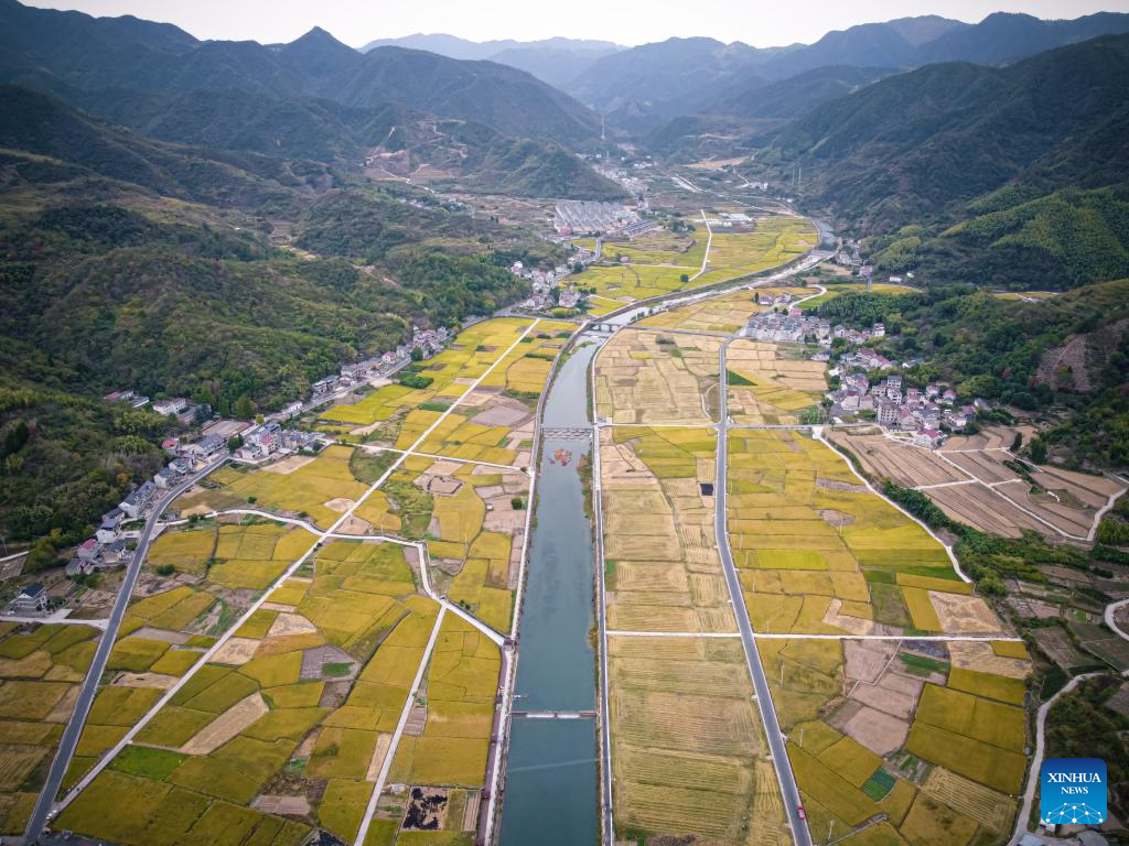 This aerial photo taken on Oct. 26, 2022 shows a view of the paddy fields at Sandu Town in Jiande, east China's Zhejiang Province. (Xinhua/Jiang Han)